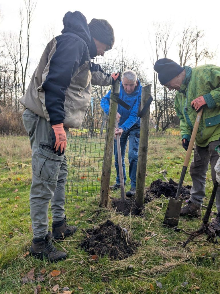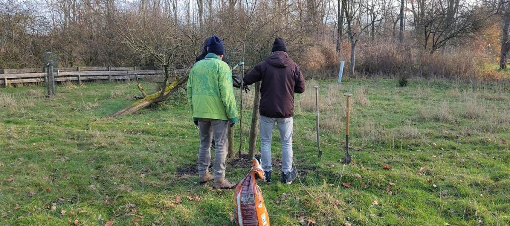 Van de ongeveer twintig hoogstambomen die we in 2023 hadden aangeplant zijn er uiteindelijk vier niet aangeslagen. Dit viel ons mee, omdat het na de aanplant heel vochtig werd, en vroeg in het voorjaar weer heel warm en droog. Gelukkig konden we dezelfde soorten nog krijgen, en die zijn vandaag de grond in gegaan.