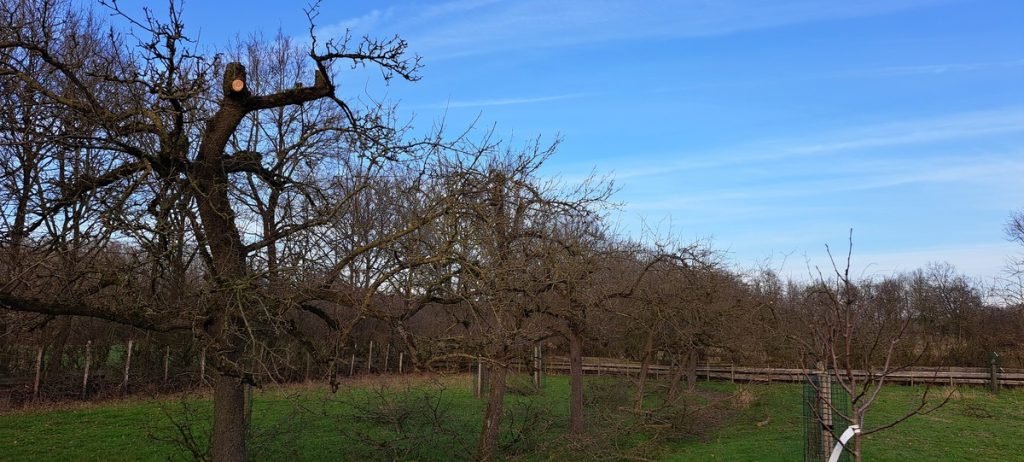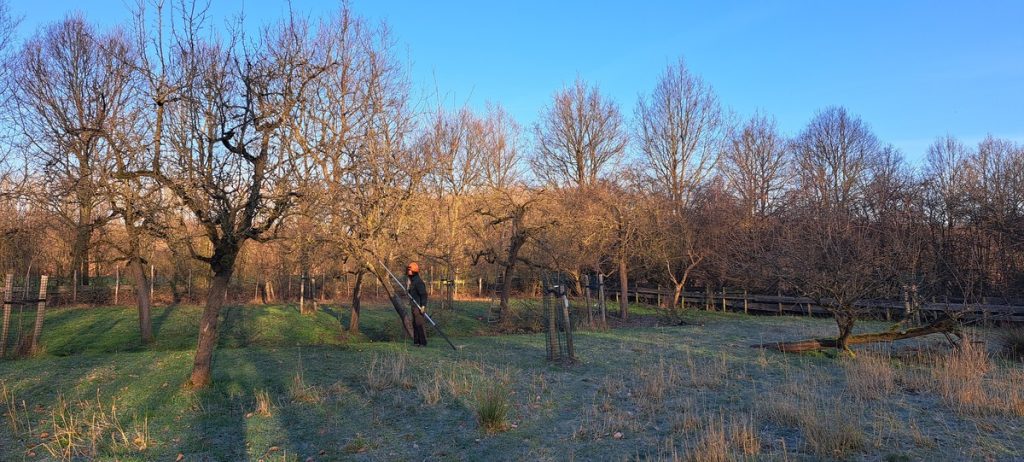 Vandaag heeft Leon de Klein ons geholpen met het snoeien van de hoogstambomen. Toen we het landgoed aankochten was er al enig achterstallig onderhoud aan de perenboomgaard. We hebben jaarlijks gesnoeid maar het nog echt aangedurft om grondig in te grijpen.