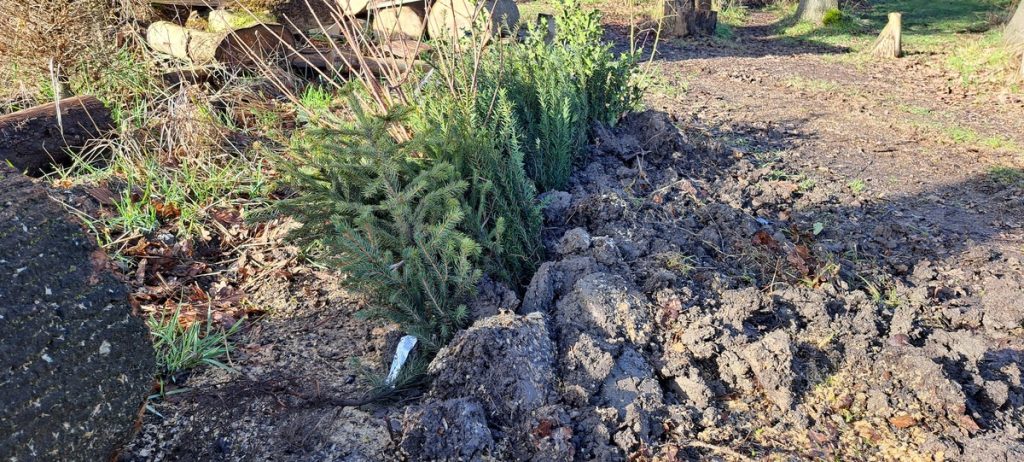 Verder hebben we dit jaar wat groenblijvende bomen en struiken uitgekozen om te planten zodat er wat groens in het bos staat het hele jaar door, zoals de fijnspar, hulst, taxus en rhodondendron.